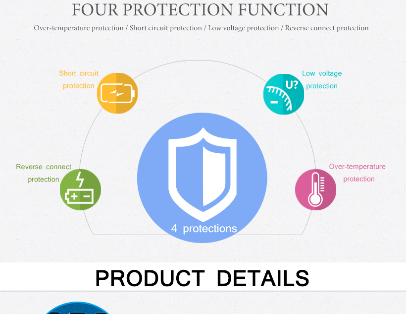 Constant voltage mode: Using the pulse width modulation(PWM) tech to control the charging current and output voltage of the charger which ensures the battery is fully charged and avoids over charging.