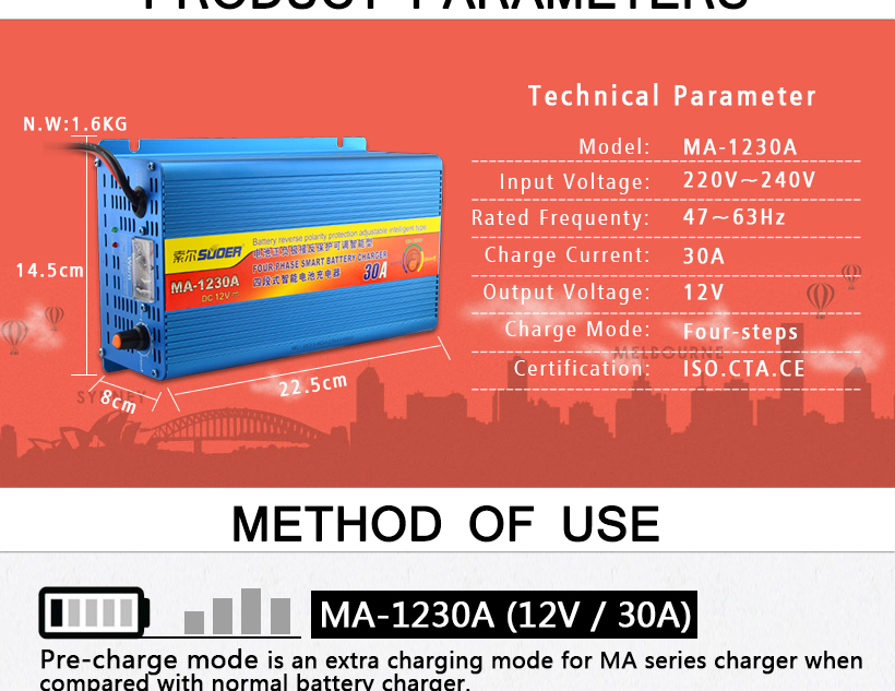 The MA series lead-acid battery charger is professional design according to the power battery of electric vehicles equipment. It uses the advanced soft switch technology, with small size, high conversion efficiency, running full loading for a long time, stable output current, high reliability, long service life, easy operation,etc. With short-circuited protection, low-voltage protection, over-heated protection. The long delay digital counter can ensure the battery from the constant voltage to the float charge reliably every time.